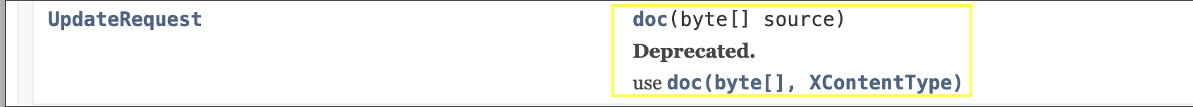 5.x 버전에서는 UpdateRequest의 doc필드가 (byte[]) 필드를 지원하긴 하지만 Deprecated라고 나와있었다. Deprecated란 아직은 쓸 수 있지만, 앞으로 버전에서 제거되지만 동작 보장이 안될 수 있다 라는 뜻이다.